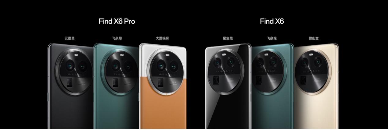 OPPO Find X6 Pro 包含大漠银月、飞泉绿、云墨黑三种高雅配色。其间OPPO Find X6 Pro 大漠银月选用小羊皮纹路的棕色素皮交融银色玻璃的拼接规划,云墨黑与飞泉绿选用磨砂玻璃原料打造出金属质感。OPPO Find X6 包含星空黑、飞泉绿、雪山金三种配色。其间飞泉绿和雪山金选用磨砂玻璃原料和低闪亮光砂工艺打造,星空黑配色选用镜面玻璃原料。